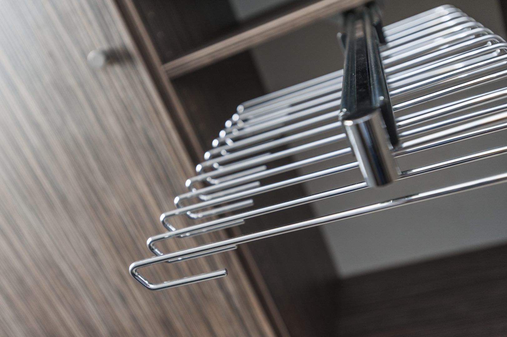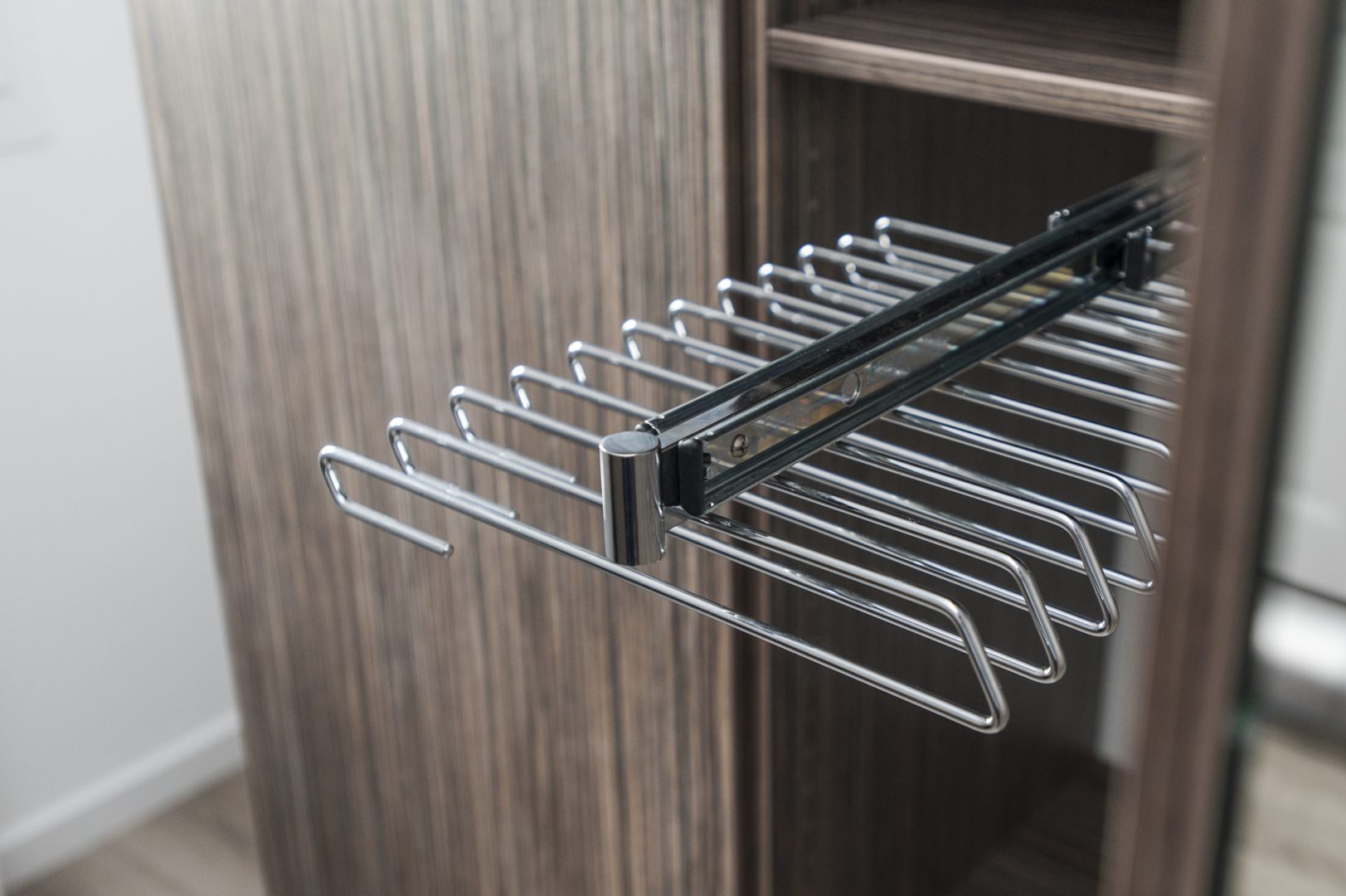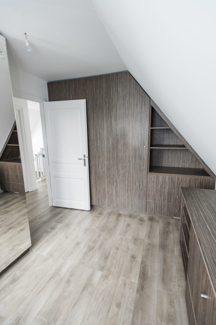 - Une armoire / dressing sur mesure en sous pente, avec porte pantalon intégré, tiroir et tablettes.